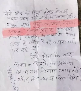 इस मामले में पुलिस अधिकारी ने बताया कि 3 सितंबर को देवेंद्र ठाकुर नाम के एक शिक्षक ने सुसाइड किया था। जिसके बाद उनके शव का पंचनामा किया गया था। जांच में मृतक शिक्षक के जेब से सुसाइड नोट मिला था। जिसमें हरेंद्र नेताम, मदार खान, प्रदीप ठाकुर सहित “पूर्व वन मंत्री मोहम्मद अकबर” नाम लिखा हुआ है। आगे की कार्रवाई कर जांच शुरू कर दी गई है। बता दें कि 3 सितंबर को आत्महत्या करने वाले शिक्षक देवेंद्र ठाकुर की जेब से सुसाइड नोट मिला था जिसमें हरेंद्र नेताम, मदार खान, प्रदीप ठाकुर सहित “पूर्व वन मंत्री मोहम्मद अकबर” को जिम्मेदार ठहराया गया है।